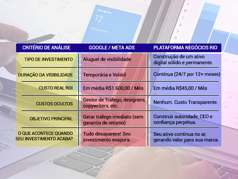 A diferença é clara: com ADS você paga por cliques. Com a NegóciosRio, você constrói presença.